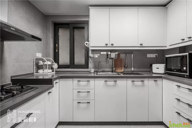 廚房是家中最有生活氣息的地方,柴米油鹽在這里相遇,烹飪了家的味道。在舊房中,廚房可通往洗衣房,考慮到實際使用時的問題,設計師與業(yè)主商議,將廚房到洗衣房的入口封起來,取消掉一條雞肋的動線,廚房可以多增加1m的操作空間,同時在洗衣房又可以開辟出一塊寵物休息區(qū)櫥柜多留出1m的距離,廚房三面都可以設立櫥柜,滿足了廚房使用的日常需求;在櫥柜設計時,左側操作臺面考慮高低層次,為也業(yè)主帶來更舒適的操作空間;廚房選用灰白搭配,與客廳色調一致,灰色墻面更耐臟。