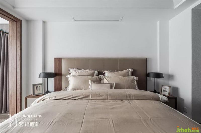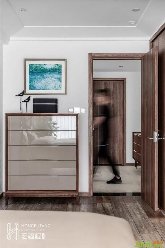 主臥門洞往左平移60cm后,原本只能容納1.9m長的衣柜,改動后可容納5.7m長衣柜,收納空間擴大三倍。主臥吊頂采用斜面設計,通過漸變的方法使空間平緩過渡,解決主臥室到主衛(wèi)生間之間60cm的大梁對空間造成的壓迫感,視覺上空間“更高”,更有層次感;主臥室門洞的位置調整,向左平移60cm,為主臥衣柜留出空間,使得整個衣柜可以拉通靠墻擺放,增加了收納空間;靠門左側設立斗柜,可以擺放物件和收納小件物品,方便分類,略微遺憾的是斗柜上面的燈光位置沒有充分考慮,燈光效果有所減弱。