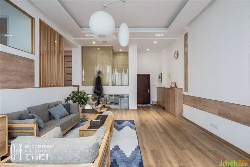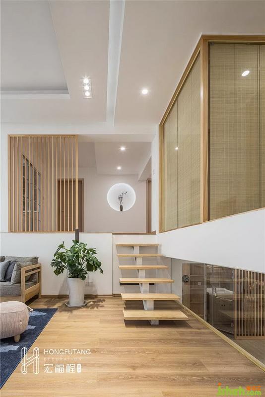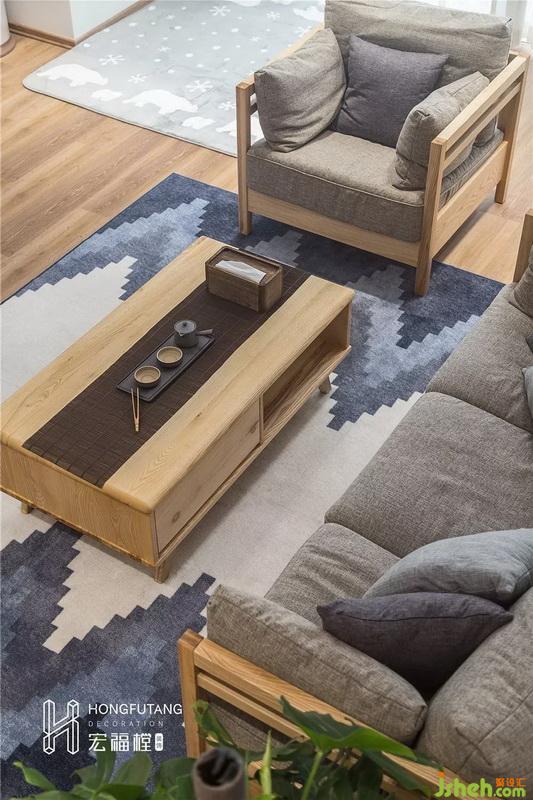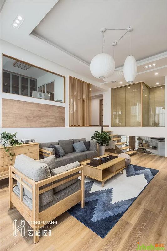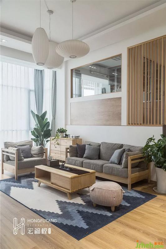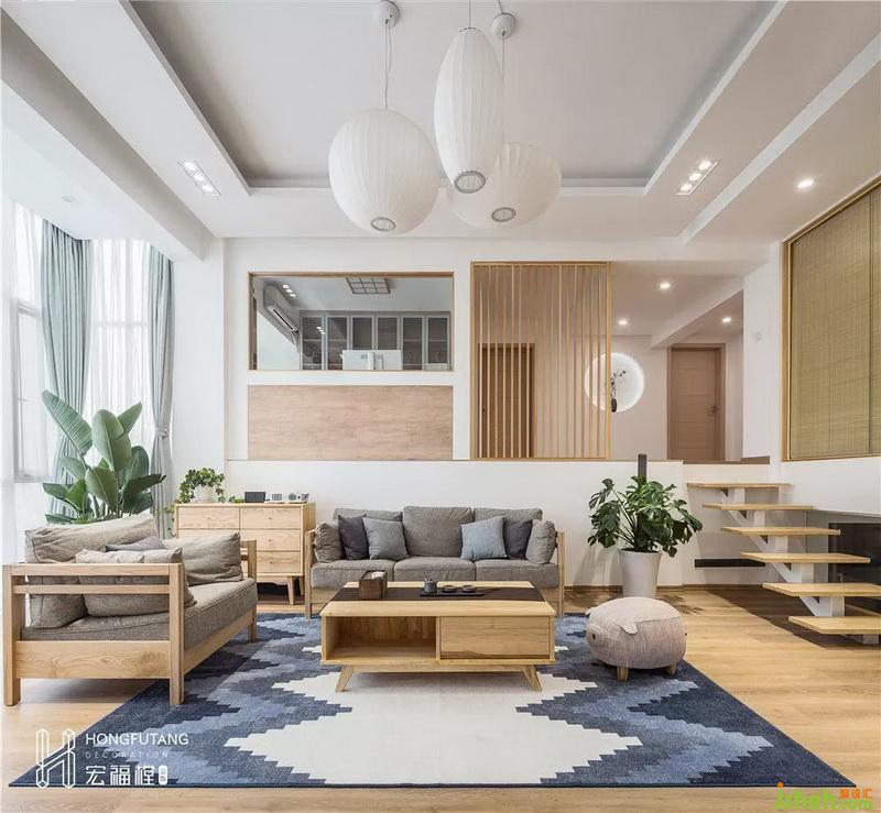 客廳用冷色調(diào)搭配原木色家具,沙發(fā)色彩是簡單的麻質(zhì)灰,低純度的色系干凈利落。選擇漸變藍(lán)地毯彌補(bǔ)小面積茶幾帶來的視覺空白;摒棄傳統(tǒng)電視,采用投影,視覺上擴(kuò)大感官,減少電視對空間的占用;客廳上方選用拇指柵欄隔離二樓公共區(qū)域,一是可以保障安全,避免從樓上摔下,二是木質(zhì)柵欄相比其他隔斷更通透;木質(zhì)樓梯清新簡潔,整個(gè)客廳沒有過多的裝飾,秉承了日式的簡約實(shí)用性。