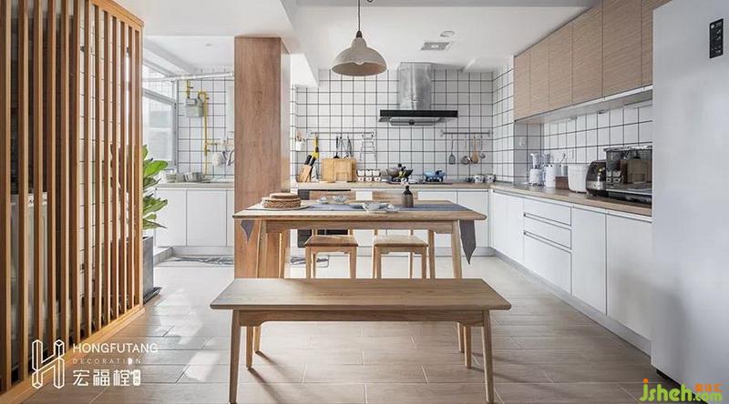 餐廳與廚房一體,打造開放式的烹飪就餐空間,明亮寬敞,開放式廚房更能增添家人間的情感聯(lián)絡(luò);餐廳右側(cè)用柵欄分隔洗衣房和晾衣空間,可以遮擋一些生活用品,提高美觀度;因業(yè)主需求,隱藏多余的物品,櫥柜數(shù)量增加;餐椅選用橫凳搭配兩把椅子,橫凳沒有椅背使得視線更開闊,餐廳柱子的出現(xiàn)會影響橫凳的擺放,所以對面選用椅子,更好的調(diào)節(jié)空間。