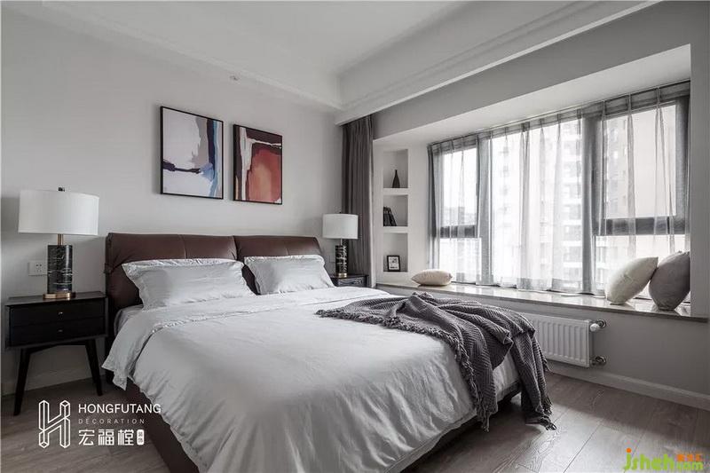 原本主臥飄窗向外凸出,室內(nèi)設(shè)計(jì)師利用右側(cè)飄窗死角做成斜切嵌入式壁龕,更加合理的利用了小空間,也為主臥增添了收納展示空間。