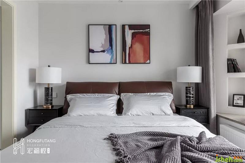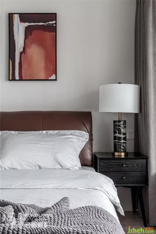 主臥墻面色彩素凈,室內(nèi)設(shè)計(jì)師選擇皮質(zhì)棕色床頭,材質(zhì)舒適的同時(shí)也增添空間沉穩(wěn)感;床頭選用兩幅壁畫平衡空間中心,避免大片留白。