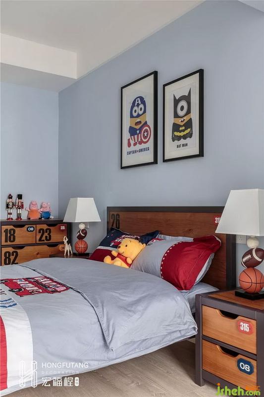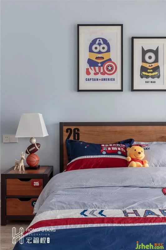 原始兒童房空間較小,所以選用擺放斗柜,可以收納小朋友玩具;衣柜設(shè)立在原有陽臺(tái)右側(cè),用衣柜分隔陽臺(tái),既增加了收納空間,又達(dá)到相互獨(dú)立的效果;陽臺(tái)左側(cè)擺放書桌,可以用于小朋友學(xué)習(xí)閱讀區(qū),考慮到是小朋友是弟弟,兒童房元素主要以男孩運(yùn)動(dòng)為主。