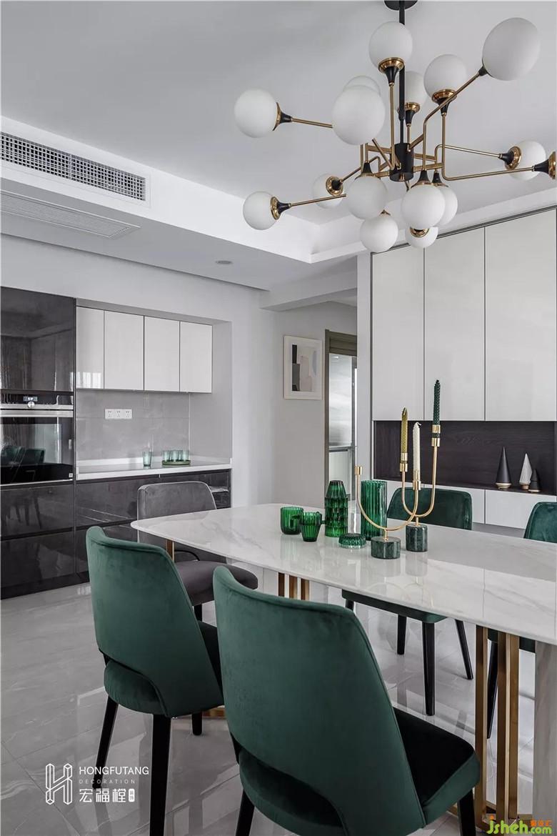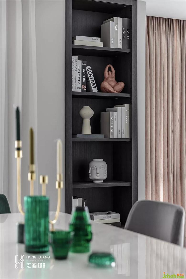 餐廳與客廳在同一空間內(nèi),室內(nèi)設計師利用原始的窗戶處設立擺件柜,將兩個空間分離。餐廳承載了較多的公共收納空間,除了窗邊擺件柜外,靠墻一側設立滿柜,下方懸空位置為插座預留處和擺件區(qū),鏤空位置可以作為裝飾區(qū)和小家電操作區(qū)使用;餐廳一側墻體向生活陽臺方向內(nèi)退,增加西廚功能區(qū)域;綠色系軟裝的使用,營造自然的氛圍,美居生活舒適輕盈。