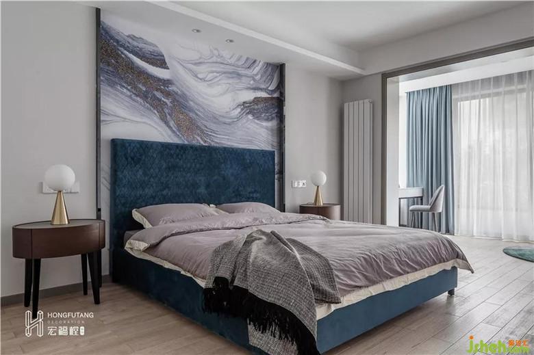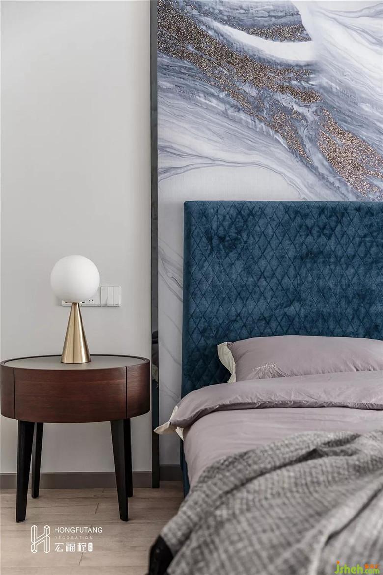 臥室空間本就是感性需求更多,主臥空間延續(xù)客廳風(fēng)格,室內(nèi)設(shè)計(jì)師在軟裝上搭配絨藍(lán)作為整個(gè)床體的顏色,山水抽象畫用作背景墻,色彩風(fēng)格與整體色彩一致,臥室空間更加靜謐平和。