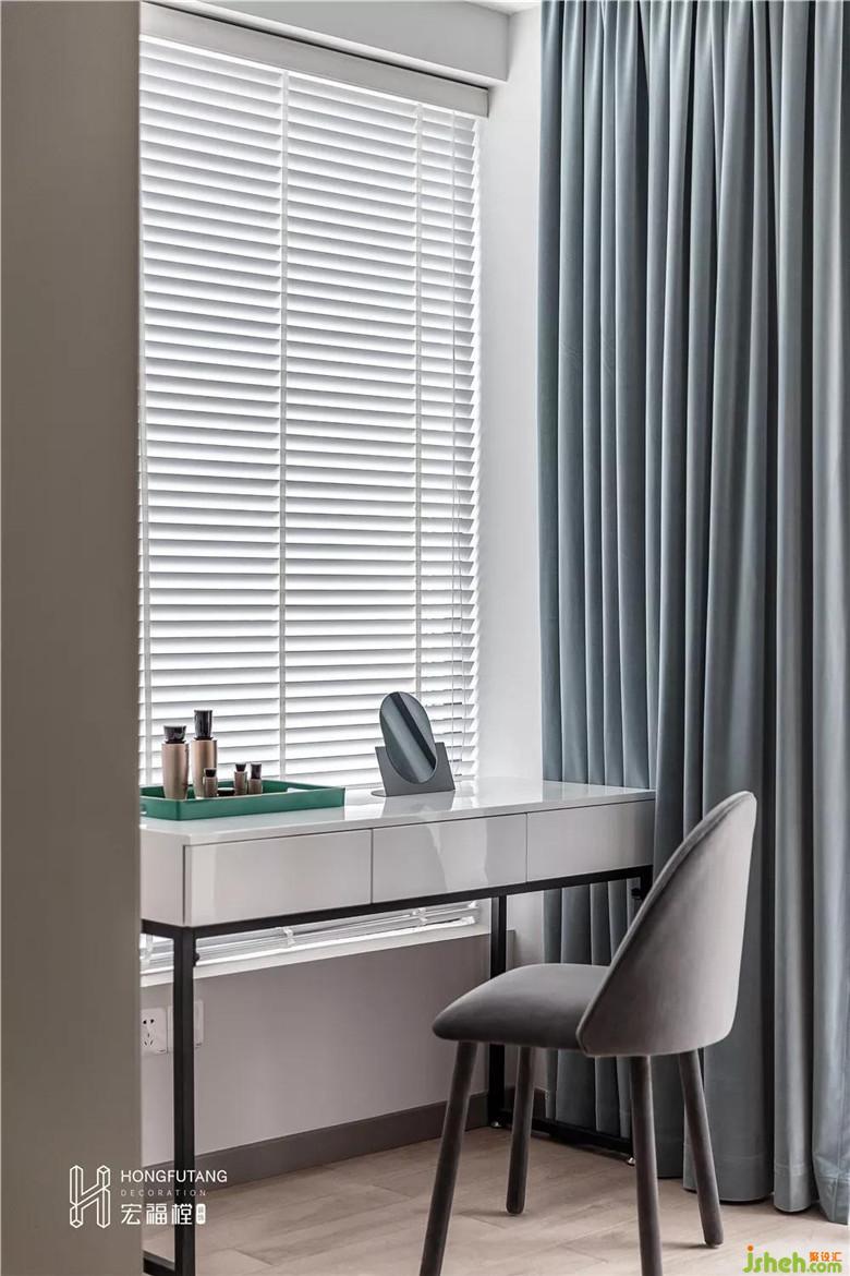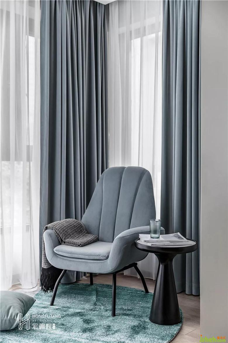 臥室陽(yáng)臺(tái)空間一側(cè)作為簡(jiǎn)易梳妝臺(tái)使用,一側(cè)用作休憩看書空間使用。室內(nèi)設(shè)計(jì)師選用灰綠色作為軟裝主色調(diào),運(yùn)用在沙發(fā)椅和窗簾上,由藍(lán)至綠的過(guò)度,是空間由暗向明的變化,青藍(lán)相接,將感性空間融入一絲平和向上的生命氣息。