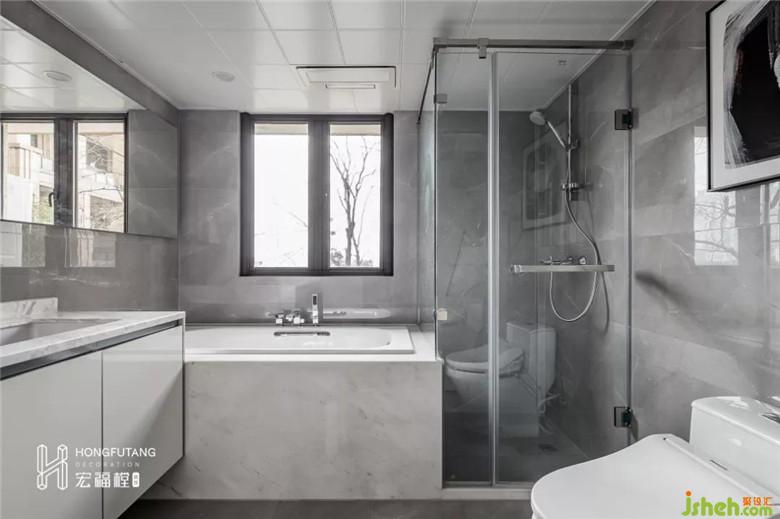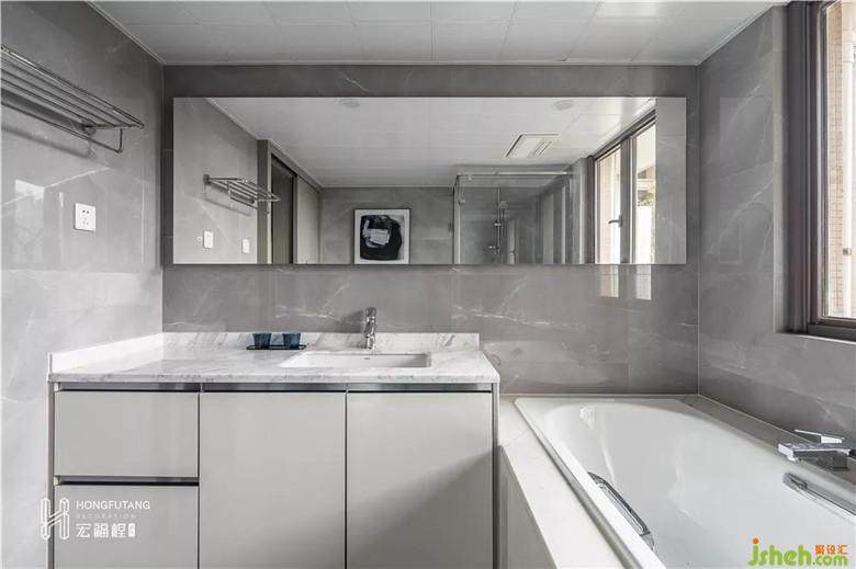 在主衛(wèi)有限的空間下,室內(nèi)設(shè)計(jì)師滿足客戶需求,將浴缸和淋浴間合理排列在同一空間內(nèi);灰白大理石臺(tái)面便于清潔,整潔度高。白亮光系材質(zhì)光澤使空間質(zhì)感提升,具有舒適與美觀并存的感受。