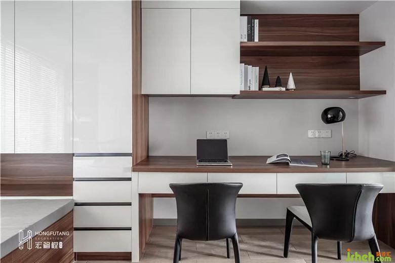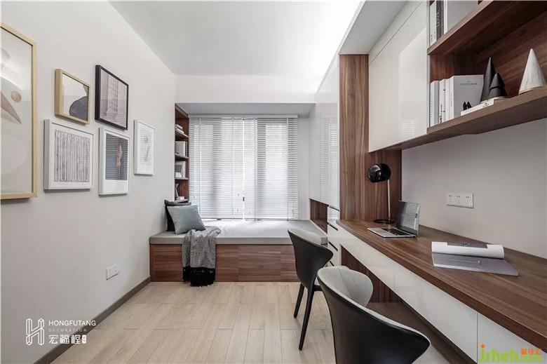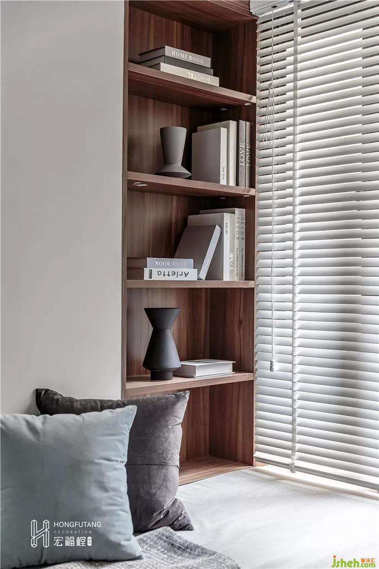 書房空間可以同時(shí)滿足兩人辦公,室內(nèi)設(shè)計(jì)師選用榻榻米設(shè)計(jì)能滿足偶爾小休和客人入住,利用榻榻米兩側(cè)空間設(shè)立收納擺件空間,將書房的功能性放大。選用木質(zhì)家具,給人以溫潤(rùn)寧?kù)o的工作氛圍。
