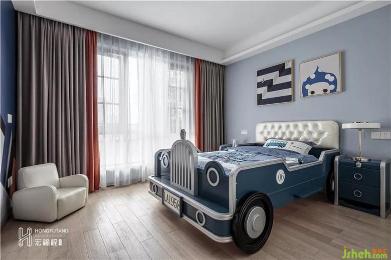 兒童房整個(gè)風(fēng)格更為活潑,跳躍的橘色系的運(yùn)用、獨(dú)特的壁紙?jiān)O(shè)計(jì)、汽車造型的床、行李箱造型的床頭柜都體現(xiàn)了兒童房的童趣。