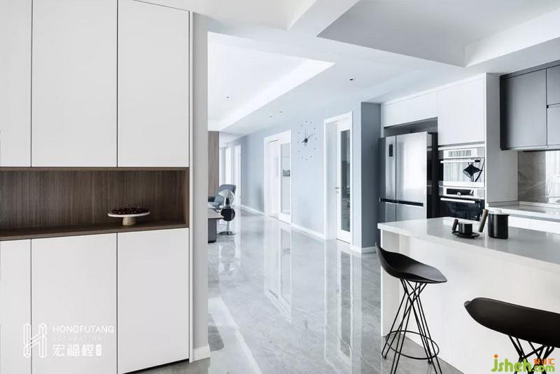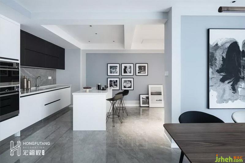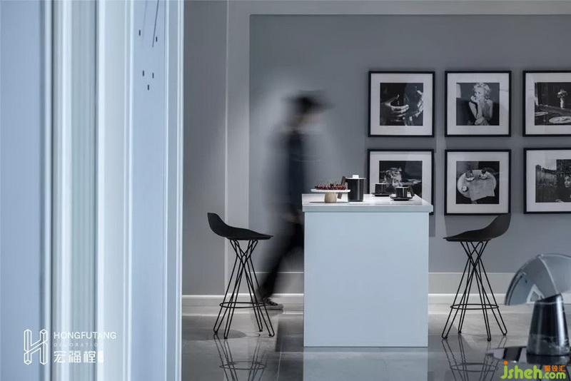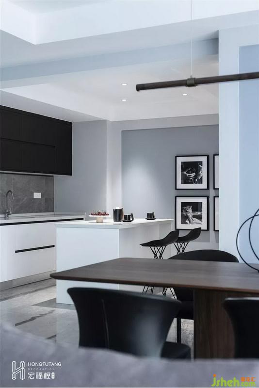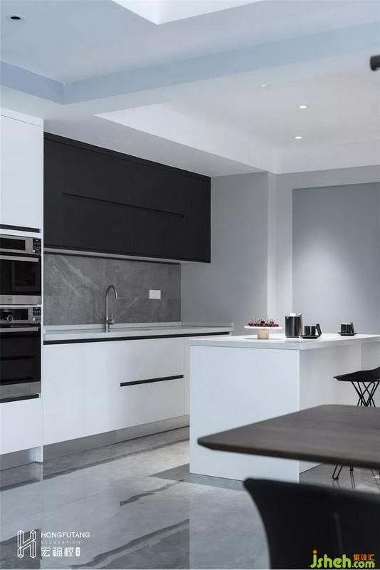 西廚區(qū)域的設(shè)置,不需要過于繁復,借黑白的色彩差異、大理石點綴,摒棄一切裝飾與華麗,追求高度真實的美。