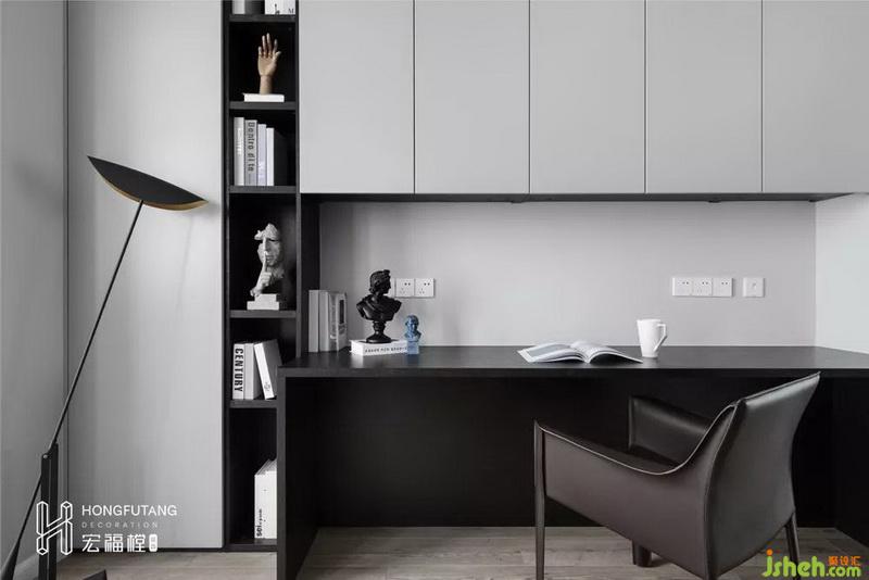 書房更顯業(yè)主的職業(yè)特征,邏輯清晰,條理清楚。書柜的設(shè)計(jì)選用封閉式,將書籍資料整潔排列,隱藏于柜門之中,便于業(yè)主在解題時(shí)思路不會受外界環(huán)境的打擾。