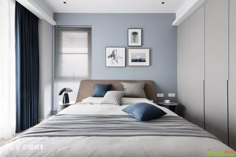 室內(nèi)設(shè)計(jì)師在主臥延續(xù)客廳色彩,月光藍(lán)帶來的沉靜感,使得主臥空間更加純凈、放松。