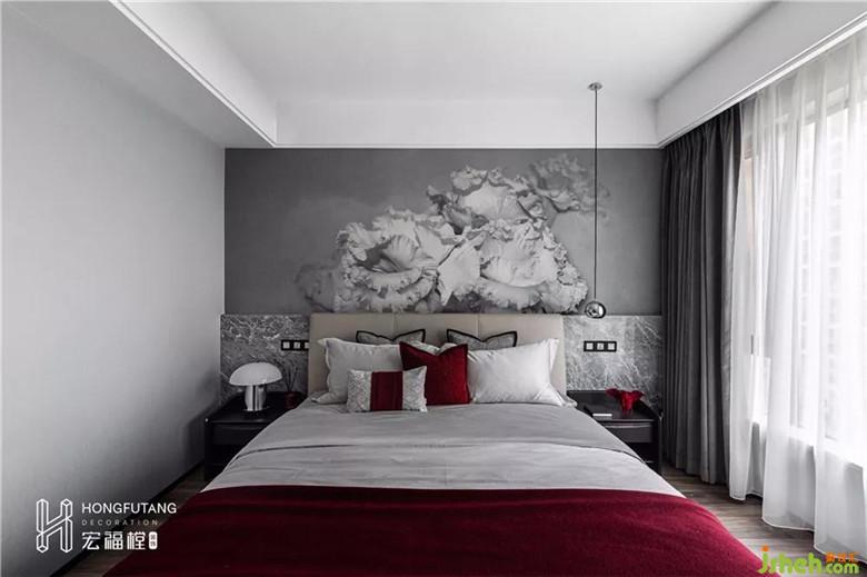 空間設計中,色彩是至關(guān)重要的因素,能起到傳遞情感和視覺提示的作用。伊夫圣羅蘭曾經(jīng)說過:“紅色是令人驚奇的!”,紅色系色彩充滿生命力,滿足了我們對于樂觀生活和愉悅身心的訴求,為忙碌的生活注入一絲絲活力。主臥延續(xù)灰色調(diào),以黑白灰來區(qū)分空間的重心,龐貝紅作為填充色。搶眼的龐貝紅成為主臥空間的點睛色,不需要占比過多,兩者交融出的色彩張力讓人難以抗拒,優(yōu)雅而時尚,尊貴而霸氣。
