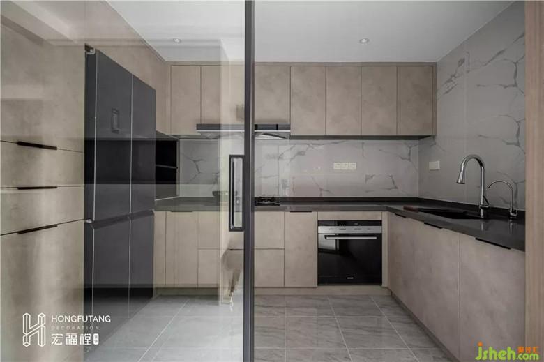 原始廚房布局不合理,采光條件有限,設(shè)計師拆除原有窗戶,改變廚房動線,合理布局廚房空間,滿足更多廚房器具的使用;推拉門的選用,使得廚房視野更加開闊,灰白色系的搭配延續(xù)整個空間的風(fēng)格。