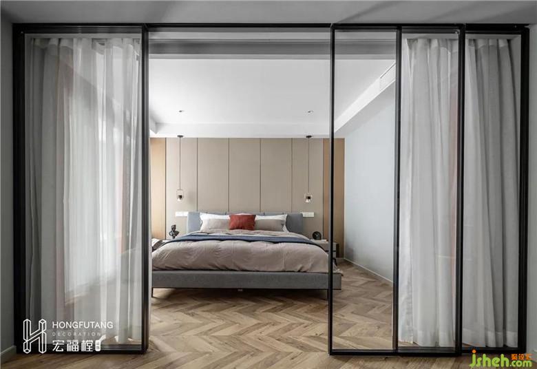 裝修公司利用極窄邊的玻璃推拉門進(jìn)行空間分割,鏡面交錯的光影,讓空間更顯通透敞亮,臥室與衣帽間有了更加緊密的聯(lián)系,增加了互動性;原木色魚骨拼地板鋪滿主臥和衣帽間,魚骨拼裝傾斜的線條對整體空間都有一定的延伸效果,整體視覺更加廣闊。魚骨地板的選用凸顯強(qiáng)烈的藝術(shù)立體感,魚骨拼接具有超“顏值”的同時,也讓空間充滿優(yōu)雅精致的魅力。