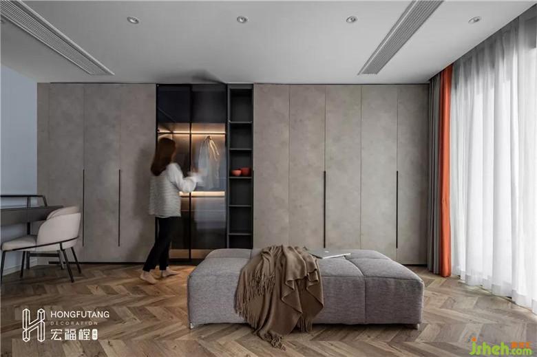 裝修公司選用半封閉式的收納柜,內(nèi)部分區(qū)清晰明確,讓所有大小衣物一目了然,滿足功能性的同時也作為美學(xué)享受;充足的衣帽空間還能設(shè)立梳妝臺。