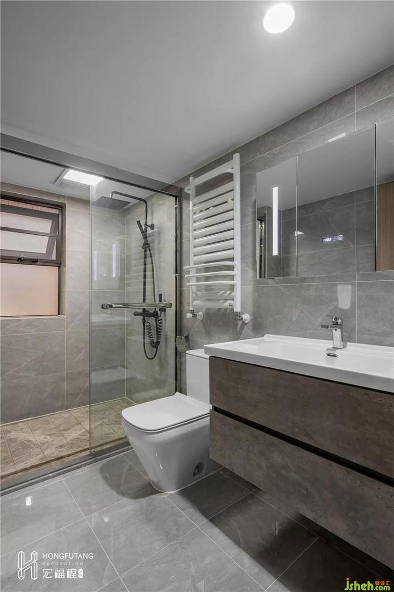 次衛(wèi)使用頻率相對較低,拆除原有隔墻,將洗浴和衛(wèi)浴空間融入一體,增加了使用面積的同時,空間視覺更加開闊;選用灰色系全瓷磚貼面,容易清理的同時,品質(zhì)感上升。裝修公司