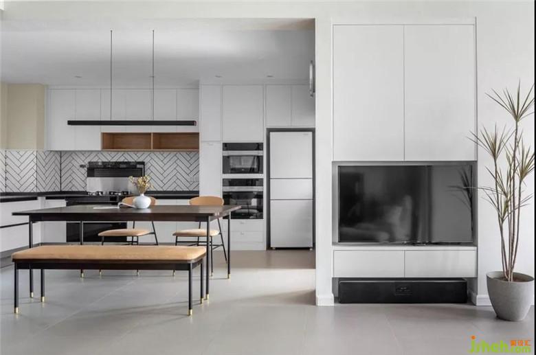 整體設(shè)計以白色為主調(diào),加上原色木質(zhì)點綴,舒適放松。摒棄了傳統(tǒng)客廳電視方位的打造,電視與墻面收納設(shè)計完美融合。