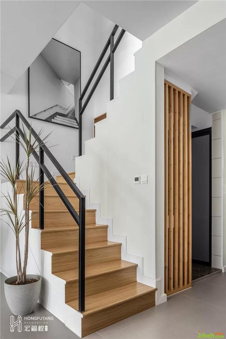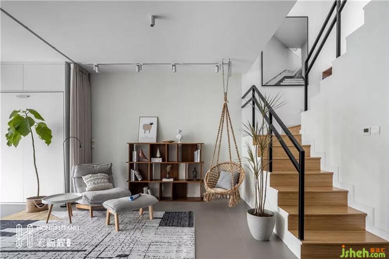 設(shè)計師改變了原始樓梯方向增大客廳空間面積,同時樓梯下部增設(shè)收納處。秋千、綠植為靈動元素,調(diào)和了空間的靜謐。