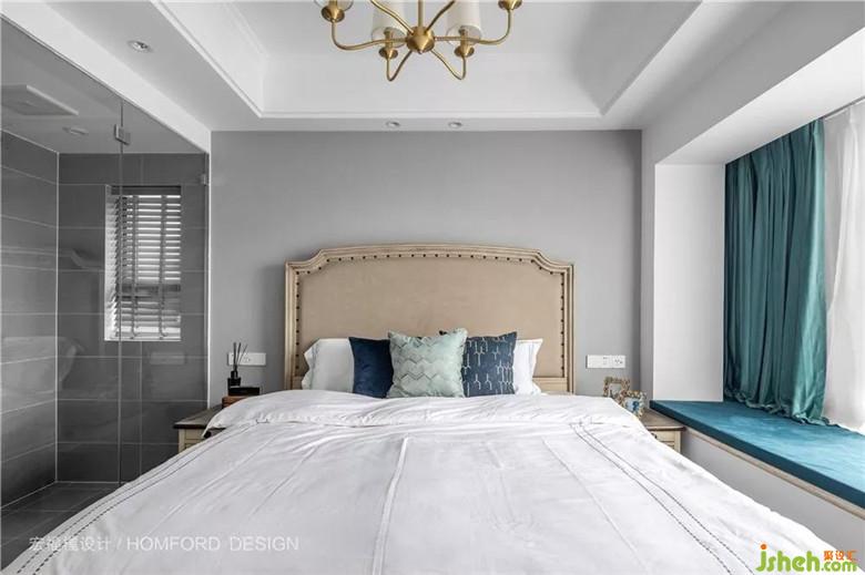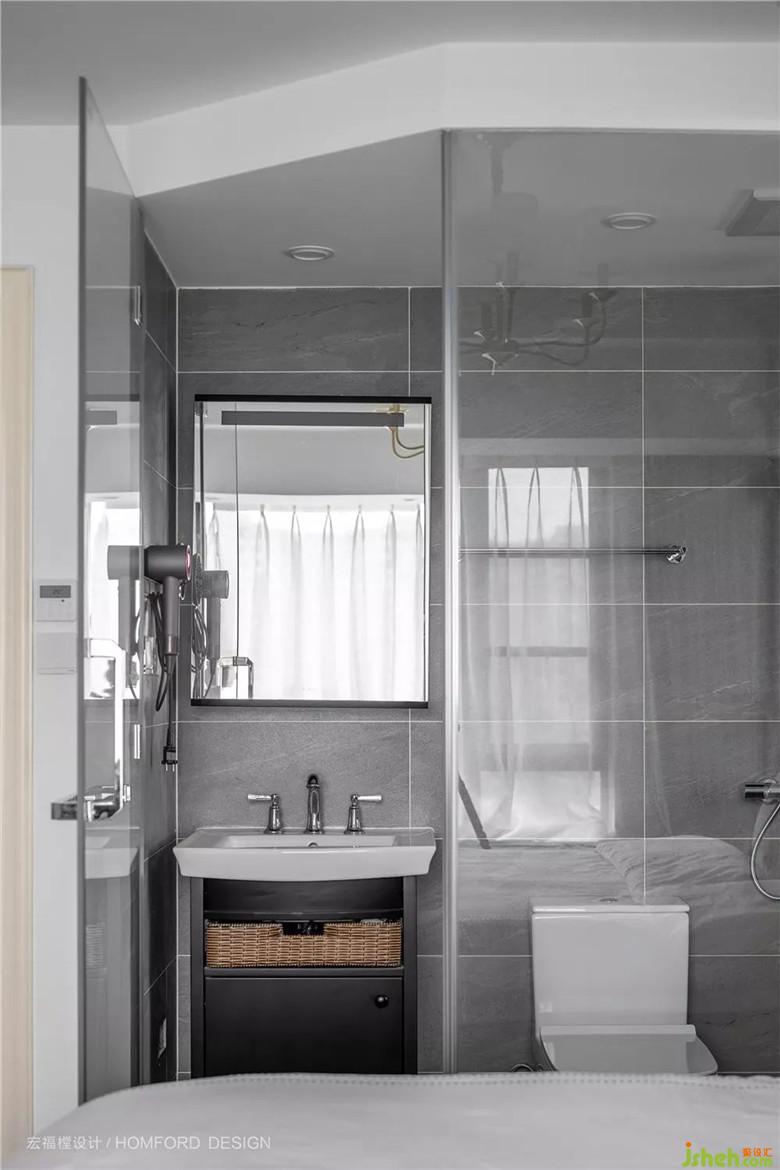 主衛(wèi)改為半開放式的空間,裝修公司用玻璃與臥室隔開,利用玻璃通透及薄的特性,在視覺上再一次的延伸主臥空間,也讓主衛(wèi)不再有局促感。