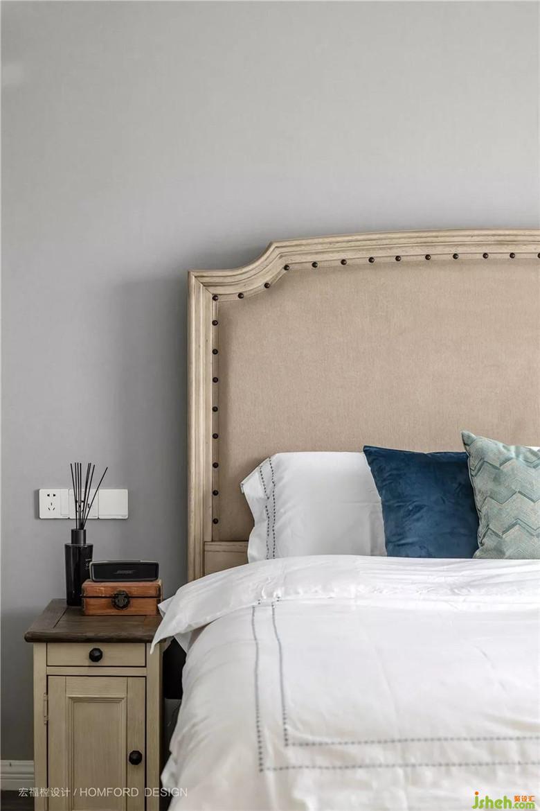 充沛的自然光帶入主臥,從美式鉚釘?shù)侥举|(zhì)柜臺(tái),顯得優(yōu)雅又質(zhì)感。簡約的線條構(gòu)筑出一種沖突的融合之美。