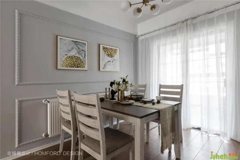 光線(xiàn)透過(guò)紗簾緩緩進(jìn)入餐廳,給明亮的日光加上了一層溫柔的濾鏡。墻面以簡(jiǎn)單的石膏線(xiàn)條搭配奶油灰,每一件物品都拒絕向媚俗低頭。