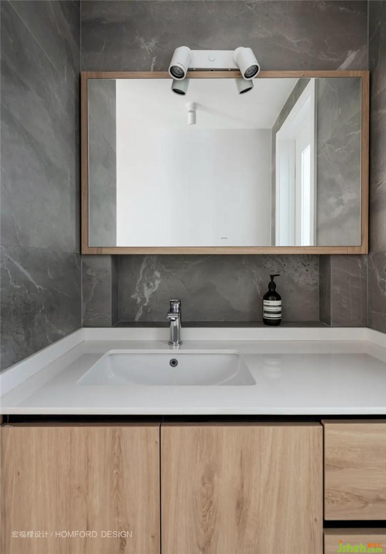 洗手臺(tái)細(xì)節(jié)處,我們利用墻體空間錯(cuò)位設(shè)計(jì)出壁龕儲(chǔ)物,這樣直觀的設(shè)計(jì)簡(jiǎn)化了拿取步驟,表達(dá)屋主一家“斷舍離”的生活狀態(tài)。