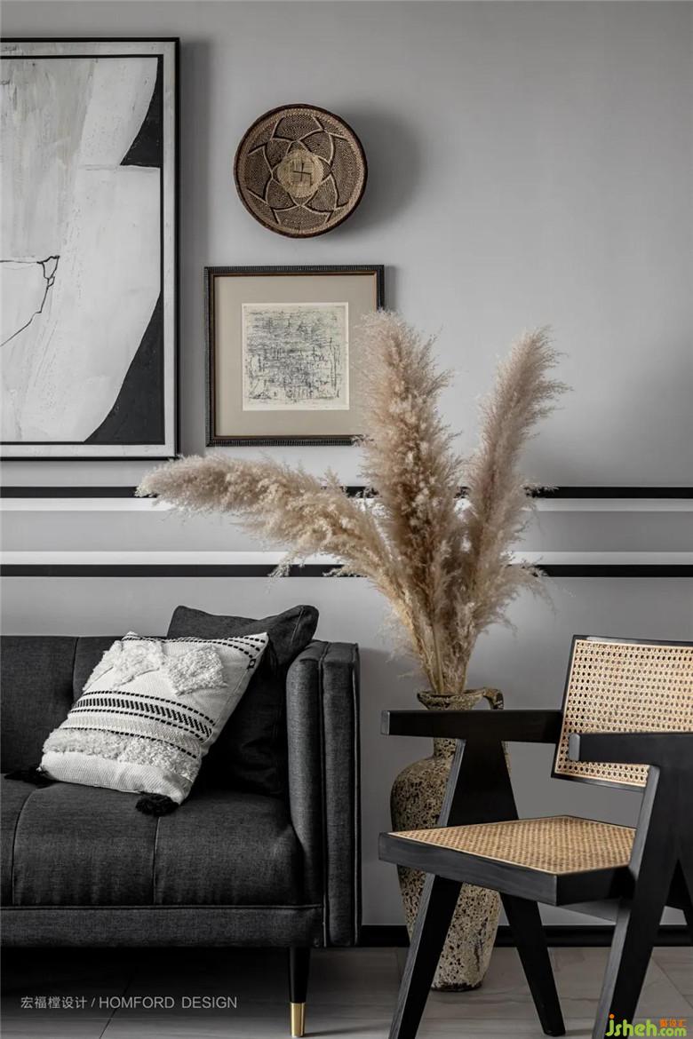 整體線條簡(jiǎn)單、用極簡(jiǎn)低飽和度色塊進(jìn)行區(qū)分。空間多處大面積留白、黑灰原木用以點(diǎn)綴,大量采用自然元素中的綠植、青苔、藤編材質(zhì)裝點(diǎn),使空間氛圍貼近自然的同時(shí)仍保留理性空間審美。