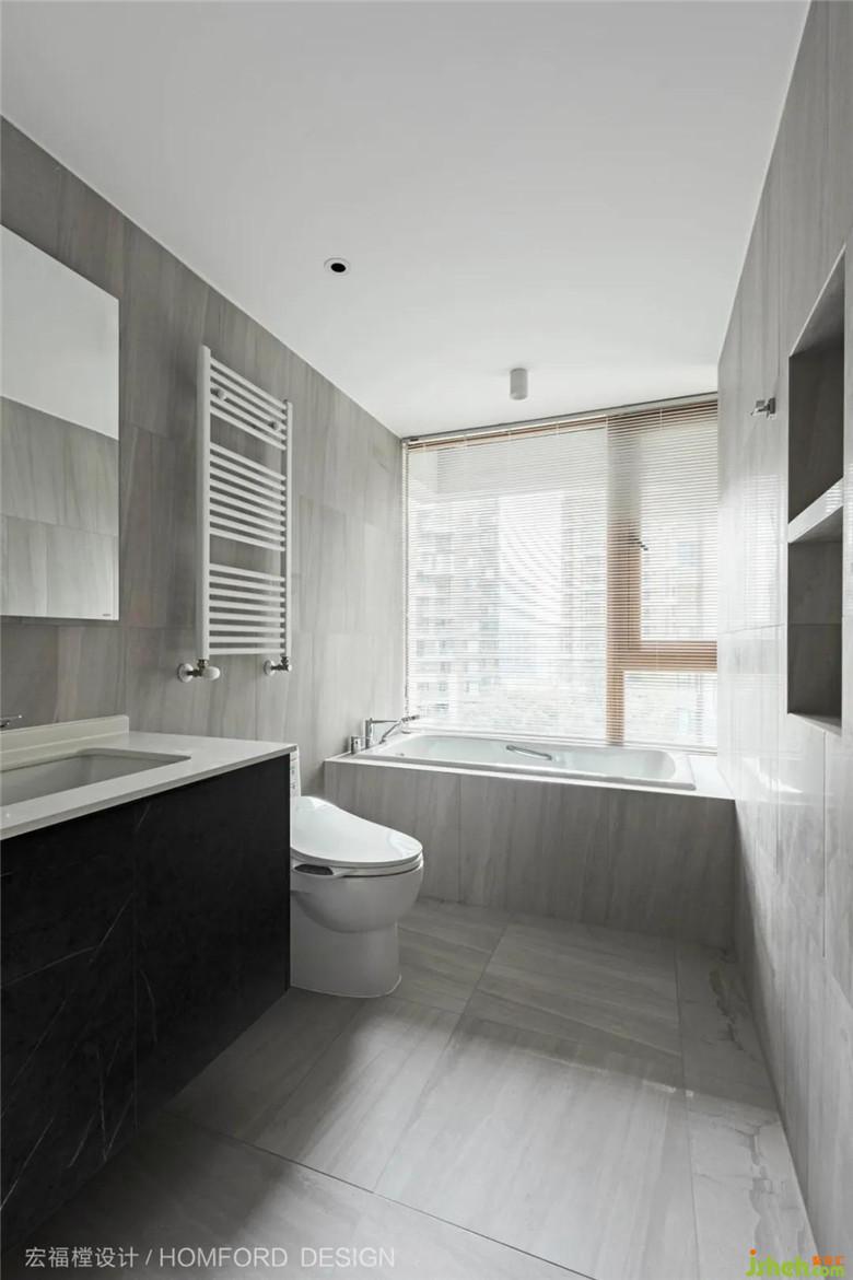 灰色的大理石瓷磚延伸至整個(gè)浴室,滿足簡(jiǎn)單的生活需求之外沒有任何繁雜的裝飾,讓身處在空間里的人完全能感受到使用情緒下的精神存在與游走。