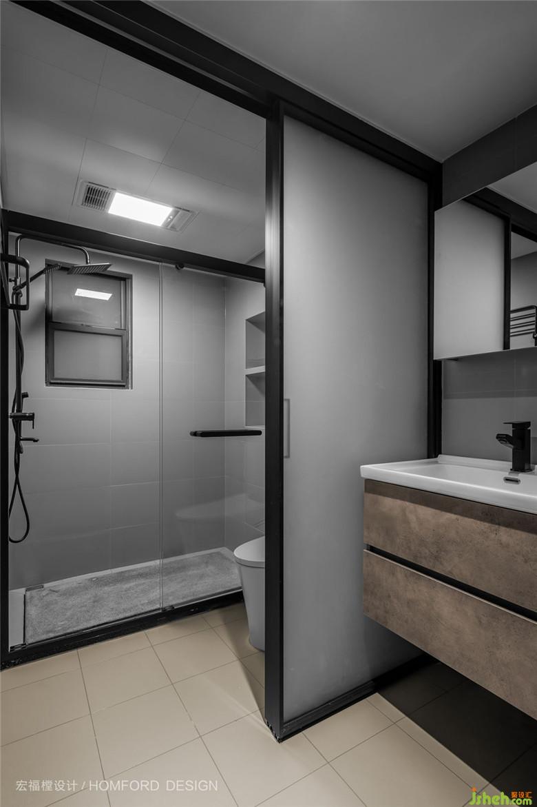 原衛(wèi)生間面積局促,我們選擇無地軌玻璃門隔斷替代常規(guī)隔墻。洗漱、如廁、沐浴功能在這4㎡的空間同時進行也不顯擁擠。小小的空間集空間美學、生活美學于一體。