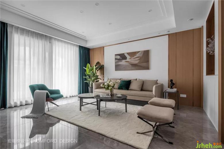 客廳采用無主燈設(shè)計(jì),動線流暢,大方簡潔而又不失現(xiàn)代時(shí)尚感。沙發(fā)墻與沙發(fā)色系統(tǒng)一,在視覺上營造出充滿藝術(shù)張力的美術(shù)效果。
