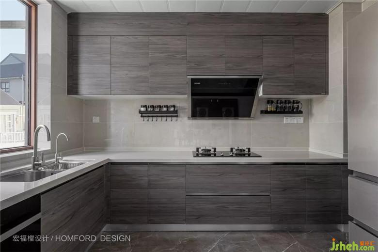 廚房與餐廳間僅玻璃吊敞門之隔,雙扇打開后空間感很大氣,悠閑的時光里可充當開放式廚房使用,做飯之余可和家人溫暖互動。