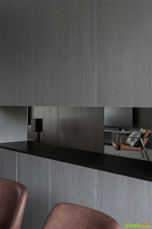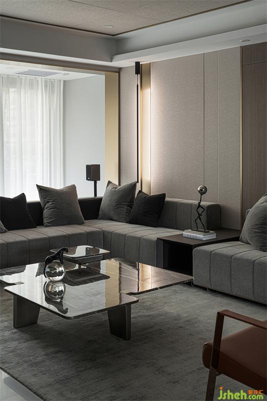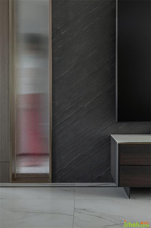飾面材質貫穿整個客餐廳空間,各區(qū)域相互呼應同時保有相對獨立性,石材、金屬材質的穿插,讓原本乏味的空間更具律動感與趣味性。