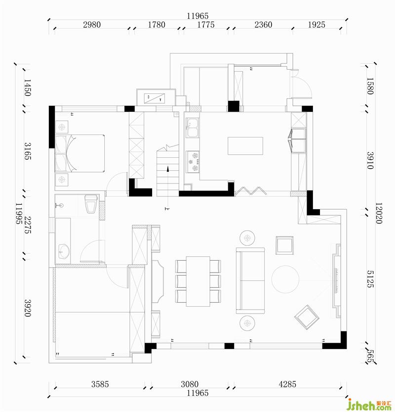 原戶型為典型豎廳格局,廚房面積局促,無法滿足他倆對使用感的訴求。于是我們進行了大刀闊斧的改造,將餐廳納入廚房整體廚房面積擴大1.5倍同時具備中西廚兩種功能,將原客房納入客廳原客廳由豎廳變?yōu)闄M廳,兩面落地窗使得采光翻倍空間更具通透性。改造后,需經過廚房再進入客餐廳。