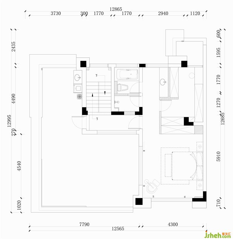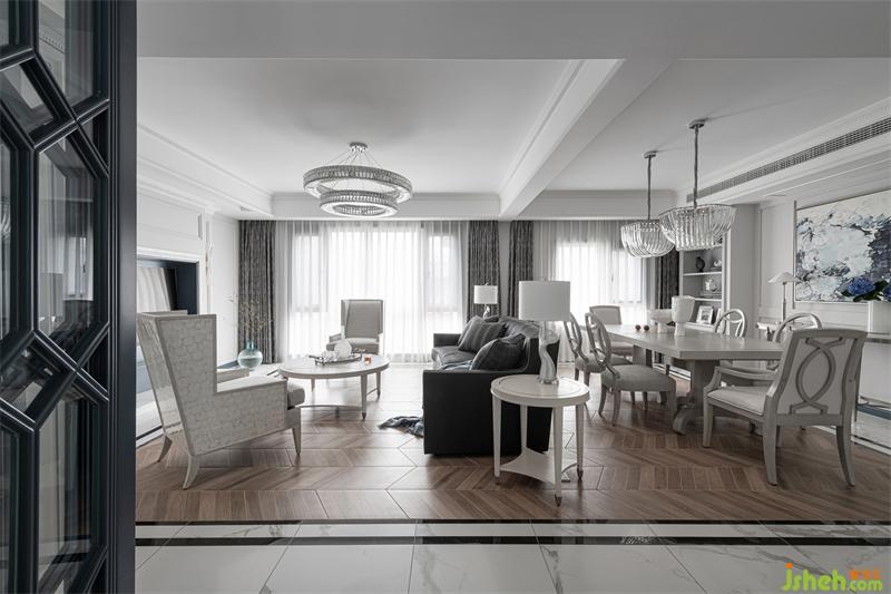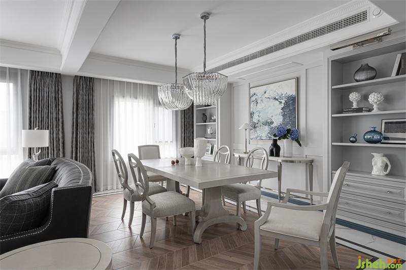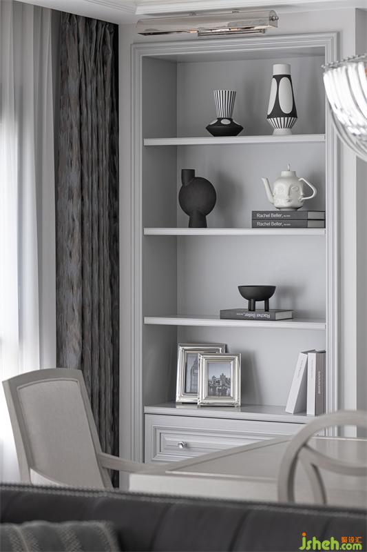客房納入客廳后由原豎廳變?yōu)闄M廳,兩面落地窗使得采光翻倍空間更具通透性。客餐廳利用頂部及家具進行三段式布局,2/3的大面積空間留給客廳,1/3沙發(fā)后的餐廳區(qū),餐廳背景墻對稱嵌入式高柜用以裝飾點綴同時兼具一定收納功能。