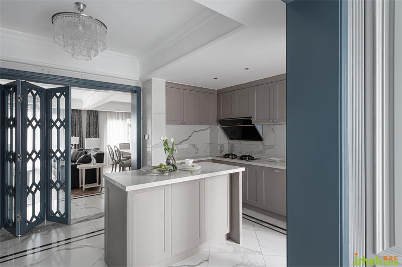 別墅設計考慮到全開放跑煙問題,我們選擇了無地軌的上吊玻璃折疊門進行分區(qū)。日常折疊收起,廚房客餐廳全開放保持LDK一體化展示;做飯時,推拉關閉非常方便。深灰藍鏤空造型時尚復古,玻璃夾層采光通透,可變型的折疊門將空間切割,形成既開放又獨立的共存關系。