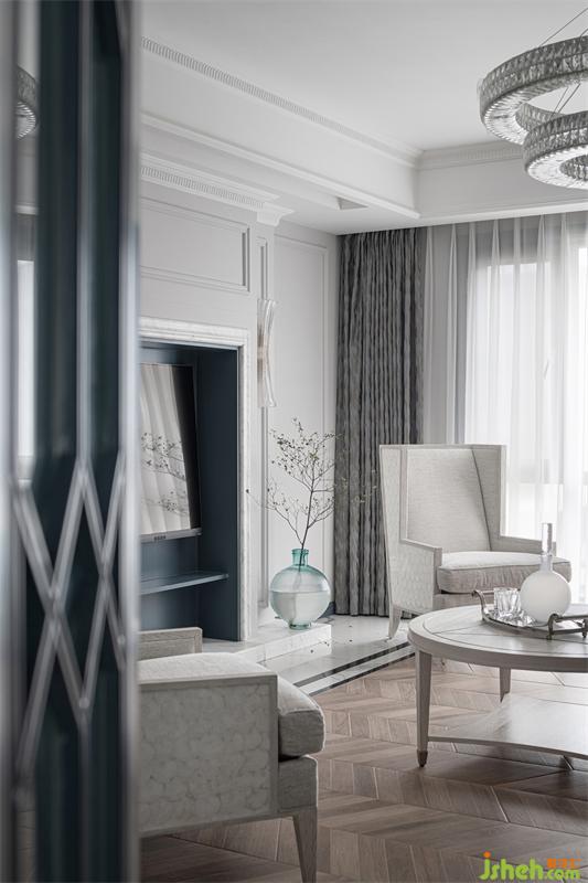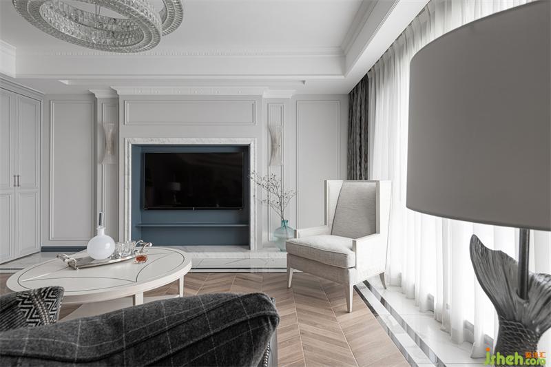 客廳整體以灰色與米色為基調亮柔、優(yōu)雅,深灰藍用以點綴,沉靜有力。地面采用暖木色仿魚骨拼木紋磚跳色做冷暖調和,清爽自然營造出居住的溫馨場景。