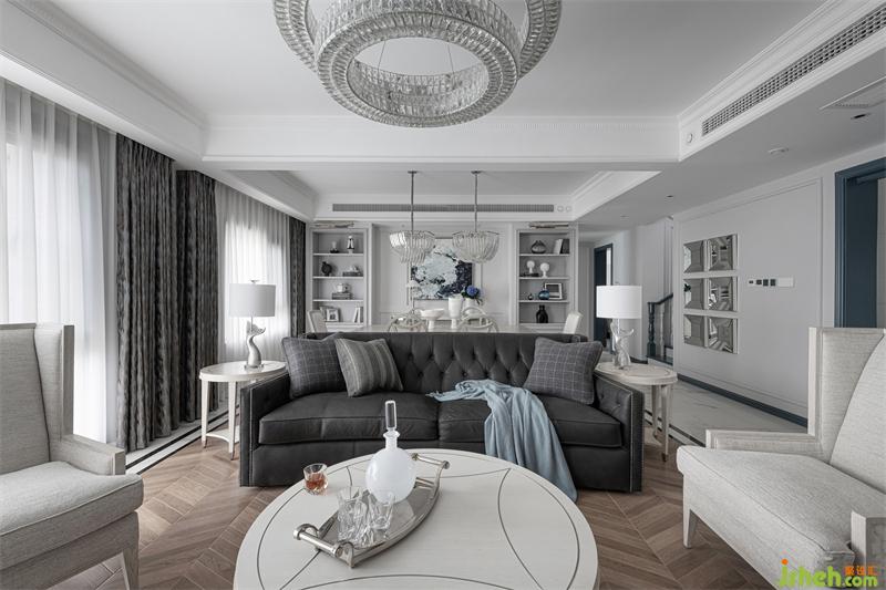 我們通過近半個月的家訪了解屋主之前的生活方式、興趣愛好,圍繞著他們獨有的一半旅行一半居家的狀態(tài)延展,提煉出關鍵詞“開放性”“儀式感”。僅兩人使用的空間實在不必碎片化分區(qū),于是我們將空間全部“打開”讓偶爾接待訪客一起使用的公區(qū)通透寬闊更具互動性,同時客房預留在一樓以備不時之需,而不想被打擾的私密空間設定在二樓更具隱私性。整屋穿插使用實木、大理石材、金屬、玻璃,融合低調內斂的藍、白、灰作為空間主色調寧靜、雅致,營造高級雅致的空間氛圍。