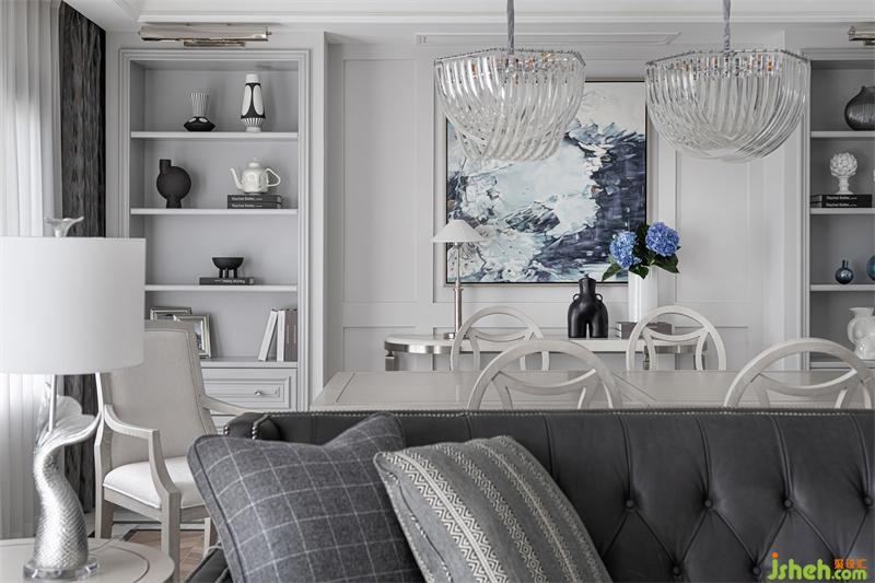 對稱感在餐廳的硬裝部分得到淋漓盡致的展示,旅行中的戰(zhàn)利品通過非對稱的方式進行陳列,讓空間平添一份活潑、靈動。藍色繡球與主掛畫相得益彰,女屋主對花材的喜愛在這里得以體現,環(huán)境所創(chuàng)造的場景與他們的生活習慣密切相連。