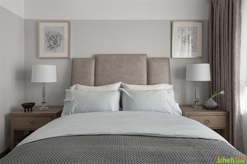 低調(diào)溫和的冰川灰作為臥室的墻面基調(diào),并進(jìn)行400mm的分色處理,讓空間更具層次感。鉚釘軟包床、藝術(shù)掛畫、玻璃臺(tái)燈、木質(zhì)床頭柜,形成現(xiàn)代與美式古典家居相融的舒適氛圍。