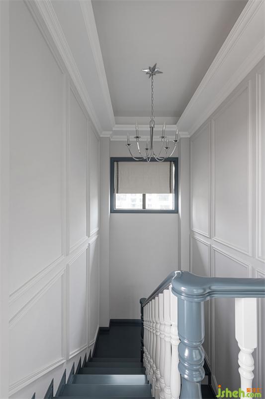 在樓梯側(cè)面,我們?cè)O(shè)置了一整排儲(chǔ)物間用來(lái)堆放清潔用品、行李箱等,因其沿用與走廊樓梯一致的裝飾線條藏而不露。模擬天井的邊頂造型貫穿全屋從一樓至二樓延伸,銀質(zhì)復(fù)古蠟燭吊燈優(yōu)雅大氣成為點(diǎn)睛之筆。