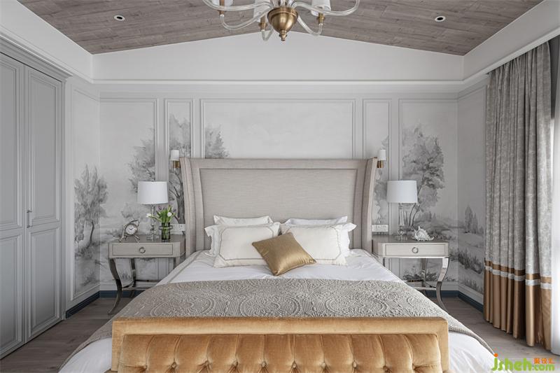 為了保持主臥的原始層高,更具空間感,我們將原始異形頂改造為穹頂造型。90°造型落地窗,花園的美景將盡收眼底。優(yōu)雅的壁畫、精致的金屬吊燈、典雅的床尾沙發(fā)、拼色窗簾,空間的氛圍如在度假一般感受。