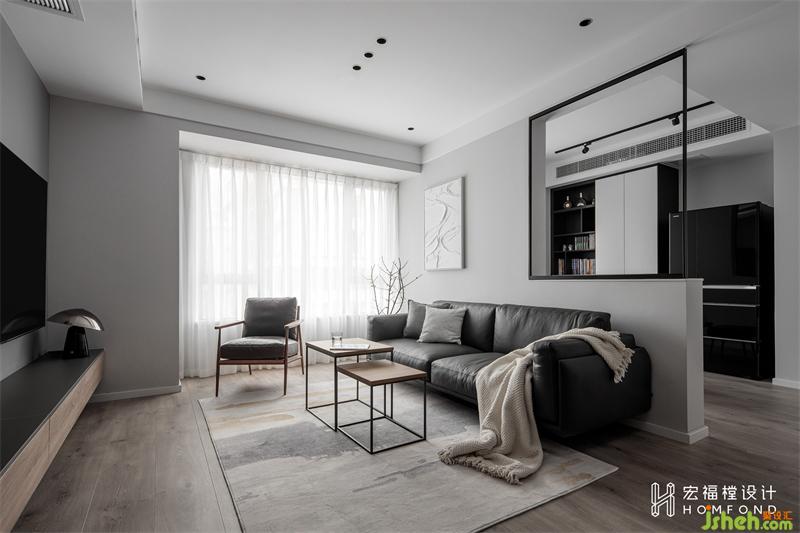 書房改造為開放式,并將客廳的墻面破開寬1300mx高1100mm面積,延伸空間視覺,擴(kuò)大公共區(qū)域面積。打破傳統(tǒng)設(shè)計(jì)理念,選擇鏤空,利用極窄邊框進(jìn)行框景,讓空間、人與人之間,更具交互感。因屋主的生活習(xí)慣是較少使用廚房,并將水及零食存放于冰箱,所以我們將其放置在外,生活動(dòng)線更為方便。