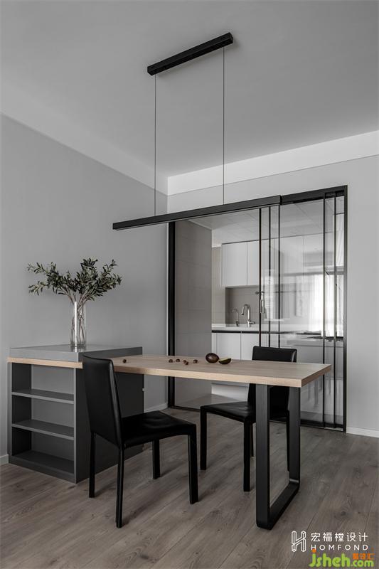 餐桌設(shè)計(jì)為屋主喜歡的島臺(tái)形式,利用石材與木質(zhì)桌板完美協(xié)調(diào)在一起。再深入研究他們的生活習(xí)慣,將石材部分設(shè)計(jì)為開(kāi)放式放置水杯+隱藏式儲(chǔ)物兩種形式。