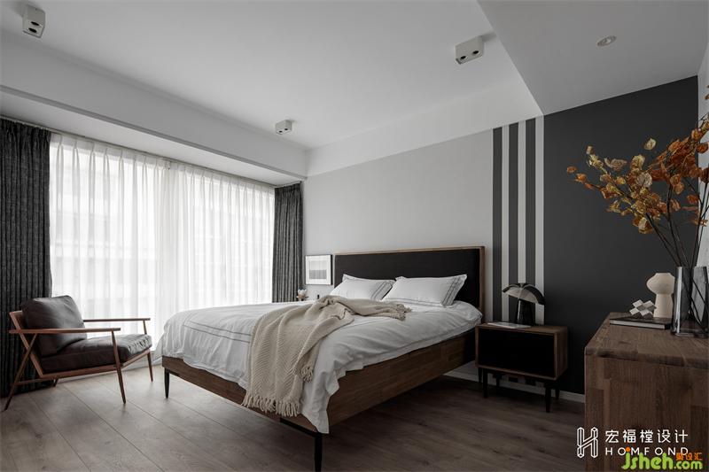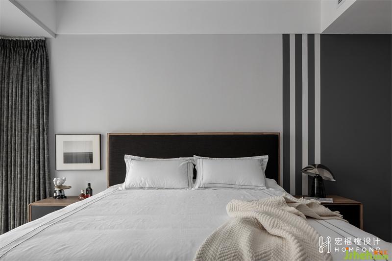 按照屋主意愿,家居設(shè)計(jì)將臥室的主衛(wèi)拆除,面積與次臥均分,主臥空間增大的同時(shí)將次臥設(shè)計(jì)為獨(dú)立的衣帽間。延續(xù)公共區(qū)域色調(diào),減少物品的陳列堆放,墻面右側(cè)進(jìn)行線條分色處理,與左側(cè)窗簾進(jìn)行平衡融合。