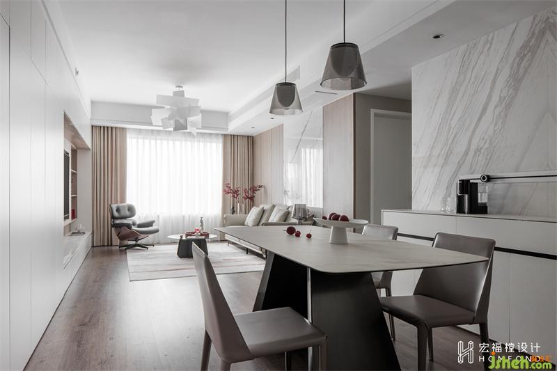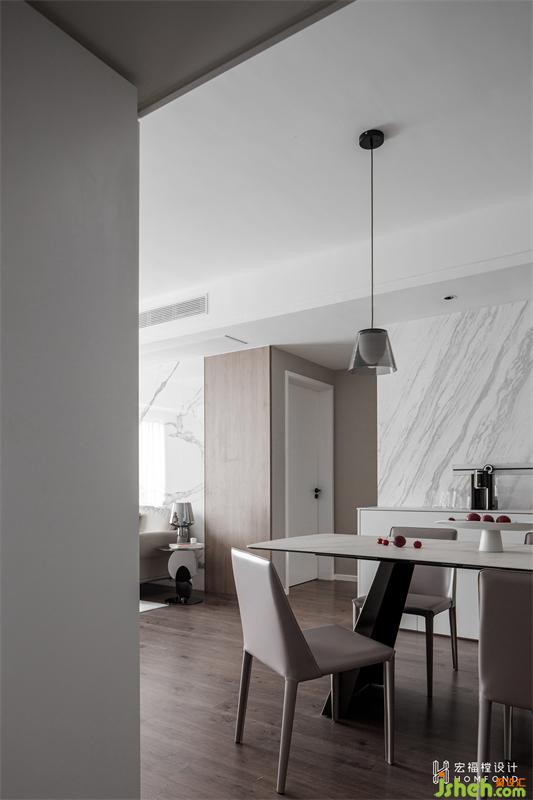 感受光與空間之間的關(guān)系,餐廳墻面區(qū)別于客廳的巖板,使用帶著自然氣息的大理石材質(zhì),層層對比凸顯出不同的元素。