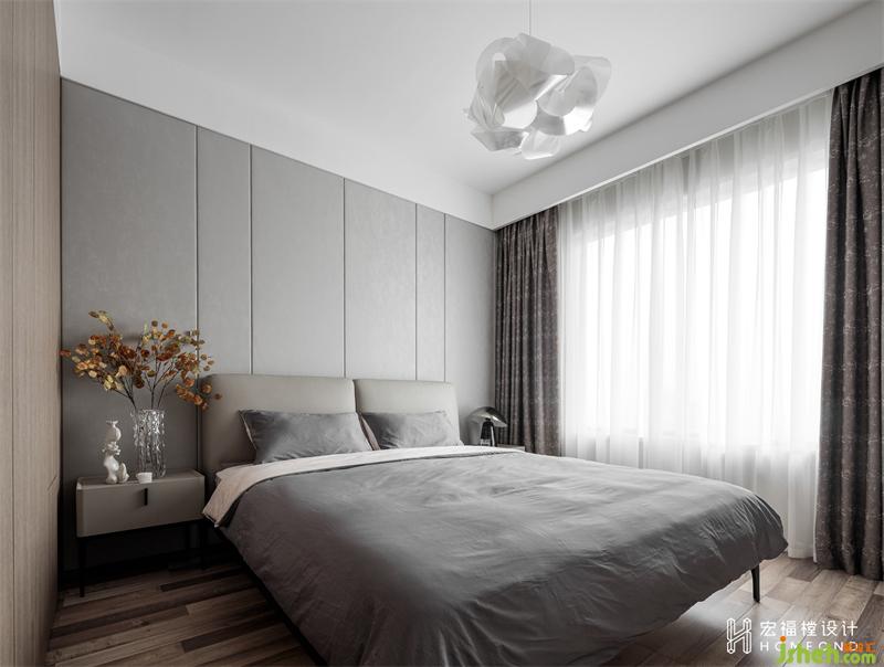 床頭墻面設(shè)計為冰川灰硬包造型,與頂面亮白色組合顯得清爽純凈。為了不顯單調(diào),地面重鋪的木板選擇混合色彩,溫和的氛圍驅(qū)散了現(xiàn)代感帶來的涼意,讓睡眠空間舒適愜意。