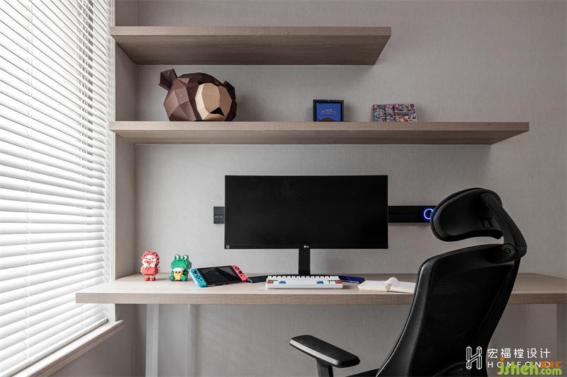 保留書房原始門洞,從隱形門外部看可容納為與主臥套房使用,從內(nèi)部看它依舊為獨立空間。將靠墻一側(cè)3270mm設(shè)計為整面儲物空間,并在柜體下方內(nèi)部放置了一張推拉折疊床,在不影響空間的情況下同時扮演著次臥的角色。