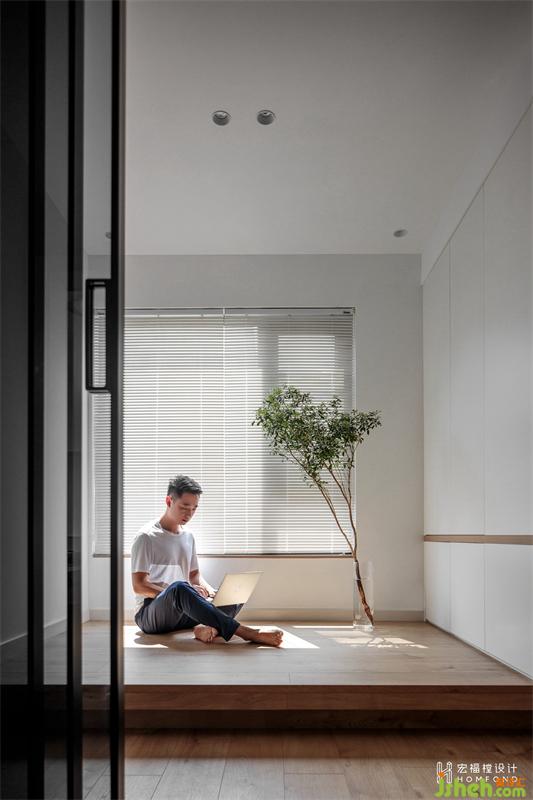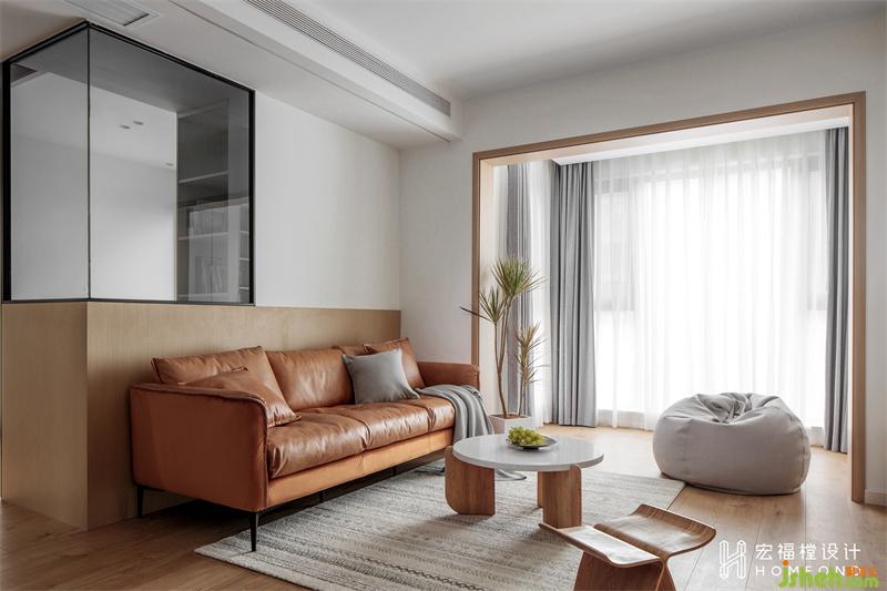 朝北的空間光線會(huì)受到影響,所以陽(yáng)臺(tái)納入客廳一并使用,并將緊鄰的隔墻與房門進(jìn)行拆除,打破局限的原始空間感,設(shè)計(jì)為簡(jiǎn)潔有力的玻璃立面,讓更多的光線照射進(jìn)來(lái)。