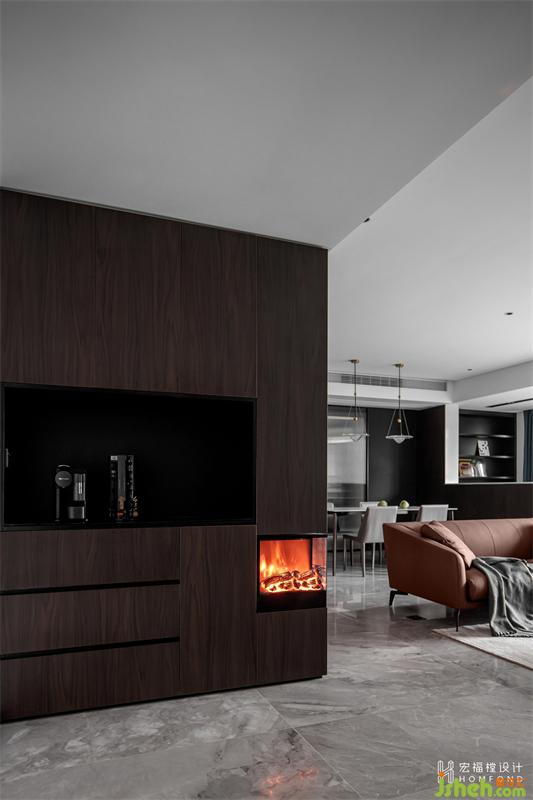 定制的電子仿真壁爐,除中和冷調(diào),讓居家氛圍更溫馨外,還有風(fēng)口為空間輸送暖氣。L型柜體挨著走廊的方向我們將其中間位置設(shè)計為1200mmx600mmx400mm(長、寬、深度)的開放式儲物形式,可放置屋主購買的家用咖啡機(jī)及一些常用水杯,下方則是抽屜柜,用于放置咖啡粉、果汁等食品類生活物品,使用起來非常方便。